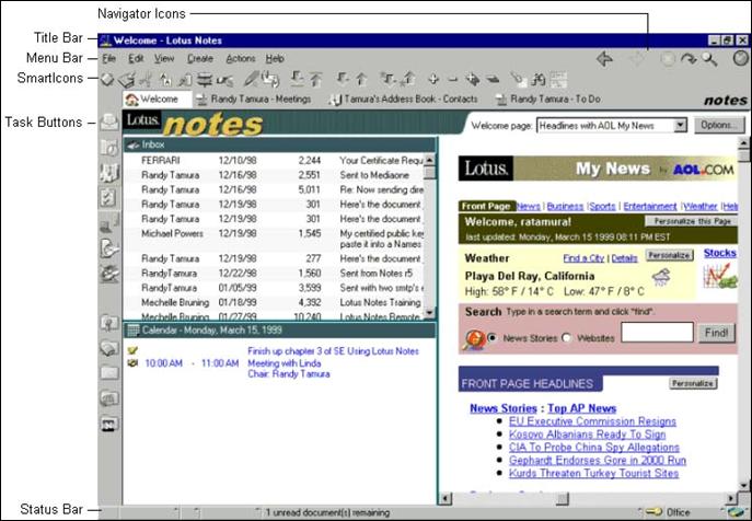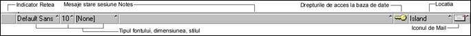 In figura 1.4 puteti vedea cateva dintre componentele ferestrelor Notes. Cea mai de sus bara este bara de titlu Windows. Continutul acestei bare se schimba in functie de context. Imediat dedesubt se gaseste bara de meniuri. Puteti activa comenzi de interes general din aceasta bara. Meniurile sunt dependente de context, ele se schimba in functie de modurile de lucru (editare, vizualizare, etc.) active la un moment dat.