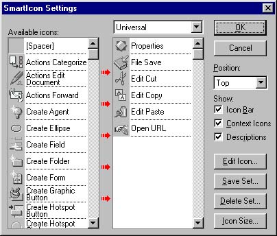 Notes ofera 170 de SmartIcons predefinite asociate cu cele mai comune operatii Lotus. Cateva dintre aceste butoane sunt active doar intr-un anumit context. Spre exemplu, un buton este folosit pentru a schimba caracterul unui text selectat din normal in aldin (litere ingrosate, bold). Daca nu sunteti in modul de editare a documentului si textul nu este selectat, butonul nu va functiona.