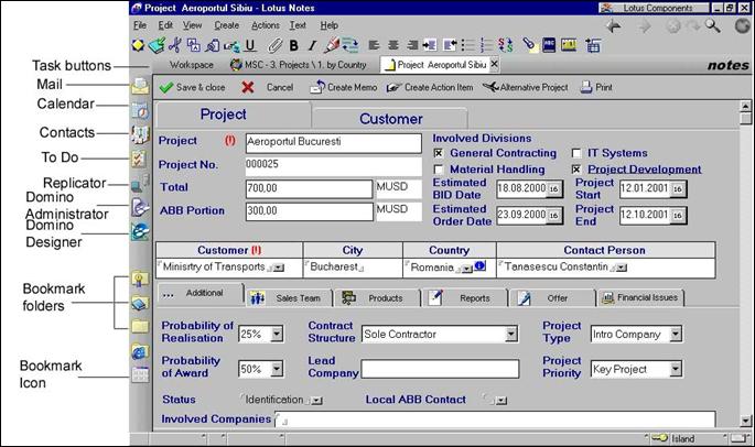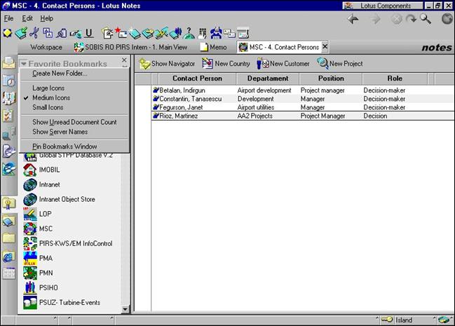 Iconurile situate pe marginea verticala stanga sunt folosite pentru a stoca bookmarks (vezi figura 1.11). Bookmarks-urile din Notes sunt similare cu cele dintr-un browser de Web. Ele nu sunt altceva decat butoane folosite pentru a stoca locatii ale paginilor Web, documente Notes sau view-uri mai des folosite. Daca vreti, sunt "scurtaturi" catre acestea din urma.