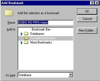 Dupa un mic spatiu pe bara, puteti gasi pana la cinci foldere (dosare) in care puteti sa va stocati propriile bookmarks. Primele trei sunt standard: Favorite bookmarks, Databases si More Bookmarks. Sub acestea trei se gasesc folderele pentru Internet Explorer Links si Netscape Navigator Links. Dupa cum le spune si numele, ele nu sunt altceva decat dosare unde se pot stoca adresele paginilor Web mai des vizitate. De remarcat ca cele doua iconuri apar doar daca browserele corespunzatoare sunt instalate pe calculatorul dumneavoastra.