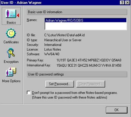 Fisierul ID Notes, este un fisier fizic care trebuie pus in conjunctie cu ID-ul utilizatorului si o parola. Cu alte cuvinte, chiar daca cineva stie parola dumneavoastra, el nu se poate lega la sistem cu ID-ul dumneavoastra fara fisierul ID. Acest sistem este mult mai puternic decat cele bazate doar pe un nume de utilizator si o parola. De exemplu, daca va tineti fisierul ID pe suport extern (disketa, CD) nimeni nu se poate loga la sistem in numele dumneavoastra chiar daca va cunoaste numele de utilizator si parola.