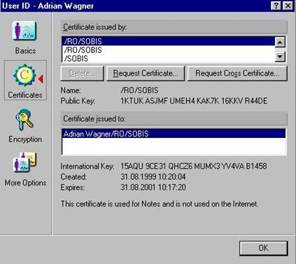 In continuare, voi descrie pe scurt celelalte componente aflate in fereastra de dialog ID. Imediat dedesubtul tabului Basics care va permite schimbarea parolei, se afla tabul Certificates care va permite sa vizualizati certificarile continute in fisierul ID, dupa cum se vede si in figura 1.17 .