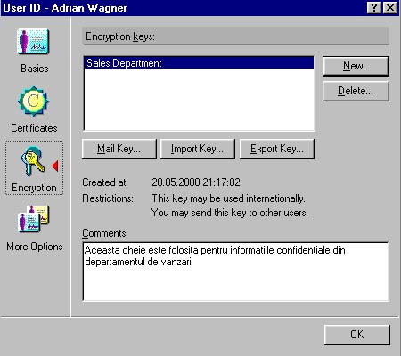 Puteti accesa si alte optiuni de management a atributelor fisierului ID din tabul More Options. De aici puteti cere schimbarea numelui, obtine o cheie publica sau crea o copie a fisierului pentru administratorul altui domeniu in vederea certificarii intr-o alta organizatie.