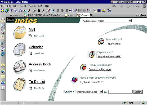 Figura 1.19 Pagina standard Welcome va ofera acces rapid la aplicatiile de baza Notes