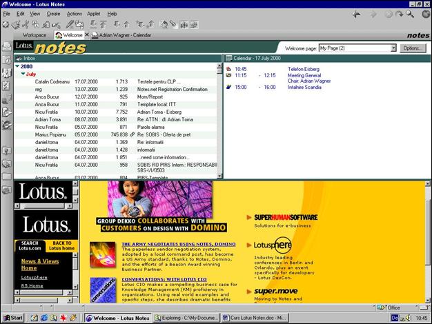 In figura 1.19 puteti vedea pagina Welcome standard. In partea stanga a ferestrei puteti observa cele patru aplicatii de baza ale sistemului Notes: Mail, Calendar, Contacte (Address Book) si lista To Do. Aceste aplicatii vor fi discutate pe larg mai departe in acest curs.