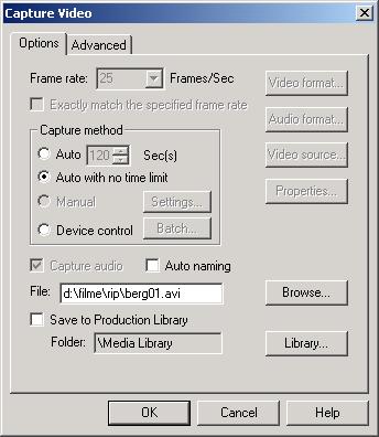 Pentru a captura cat doresti, la Capture Method alegi 'Auto with no time limit'. La file alegi numele si locul fisierului .avi care va fi capturat. In tabul Advanced eu am lasat cum era default. Dupa click pe OK apare un mesaj: