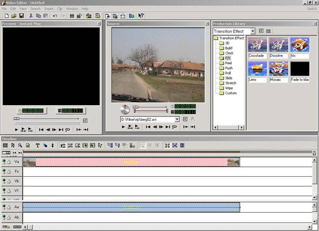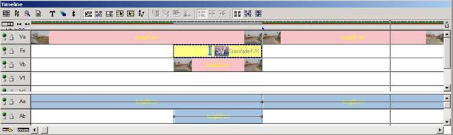 Aici e putin mai complicat. Pentru a intelege cum se face o tranzitie trebuie sa stii ca in final cadrele din linia (fluxul video) Vb au precedenta fata de cadrele din linia Va. Acest lucru de poate verifica imedia copiand spre exemplu o bucata din Va in Vb (cu Time Selection faci selectia, apoi CTRL+C, apoi schimbi pe Clip Selection si apesi CTRL+V ducand mouse-ul pe Vb in locul in care vrei sa copiezi bucata respectiva) si facand un play in fereastra de preview. Vei vedea ca in momentul in care cursorul a ajuns in portiunea in care exista flux video Vb, fluxul video Va este ignorat. Acum ca ai inteles acest lucru trebuie sa mai precizez ca toate efectele speciale de tipul Transition Effect (vezi fereastra Production Library) se insereaza in linia Fx.