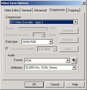 Acum in tabul Compresion daca vrei poti alege de aici codecul DivX, sau altul care doresti si sa-l configurezi pentru encodare, dar eu asa cum am spus am preferat sa utilizez VirtualDub pentru encodare deoarece imi permite sa configurez codecul DivX 5.02 Pro in asa fel incat sa fac compresie in 2 pasi (fiind cea mai buna). Asa ca am ales sa salvez filmul in format DV Video -- type 2 deoarece type -- 1 nu este suportat de VirtualDub. Deci practic nu fac nici o compresie in acest moment, astfel ca fisierul rezultat va fi cam de aceeasi dimensiune cu cel pe care l-am capturat (doar daca nu cumva am facut taieturi serioase).