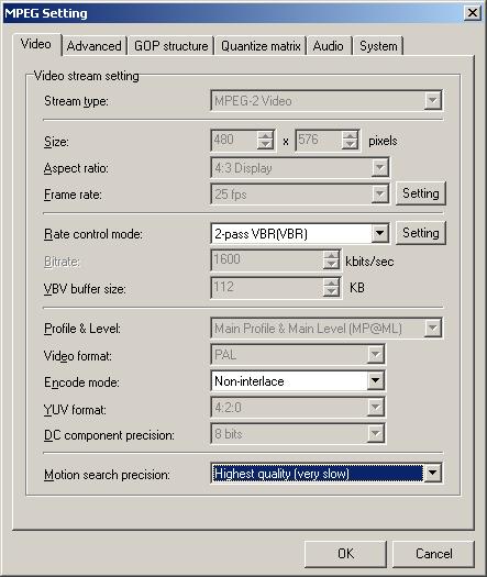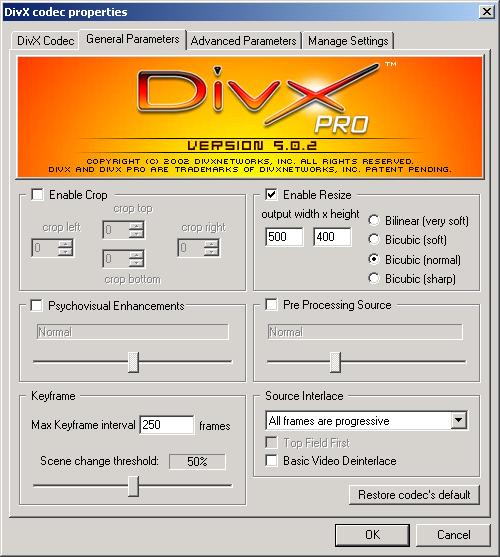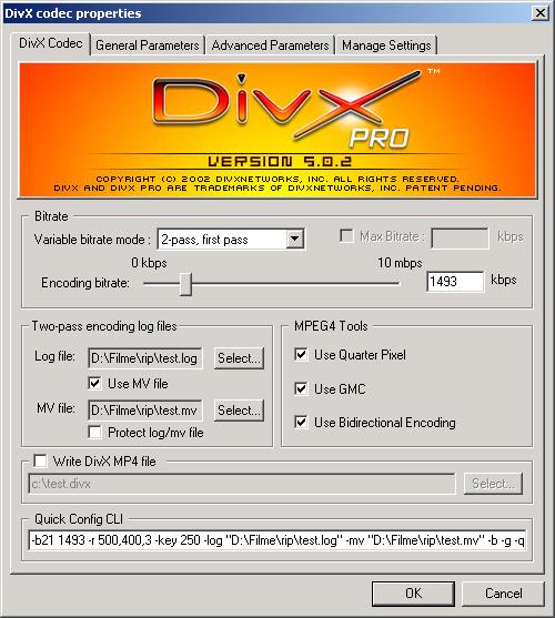 De la inceput tin sa precizez ca voi specifica setarile care le-am facut eu pentru a atinge scopul care mi l-am propus: sa reusec sa bag un film de 1 ora pe un CD de 700 MB la o calitate acceptabila, care sa ruleze la 80%-90% consum de procesor pe un sistem dotat cu P4 la 1,7 GHz. (*Revenire ulterioara: am observat ca instaland noul codec DivX 5.1 procesorul imi merge acum doar la 50%-60% *)