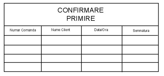 Confirmare primire - document intern societatii, face dovada livrarii produselor de catre curieri. Documentul contine date despre comanda si semnatura beneficiarului.