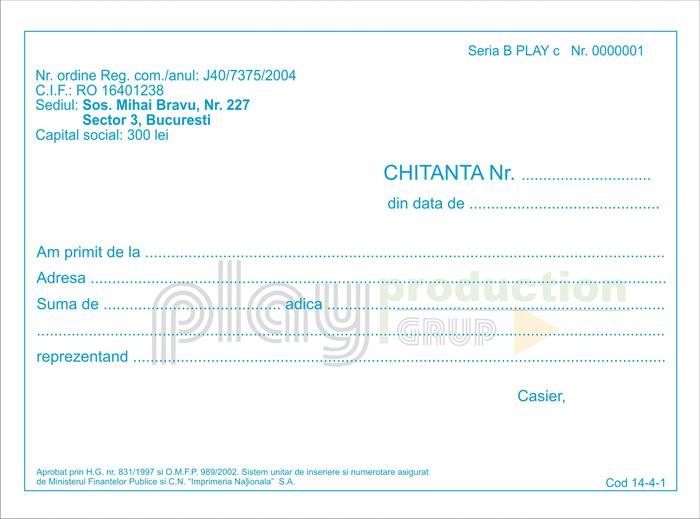 Chitanta - document intocmit la vanzarea produselor, in el se specifica datele societatii, date despre produs si valoarea acestuia. Este folosit ca dovada a achitarii produsului.