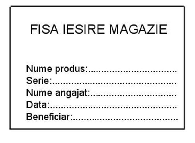Fisa iesire magazie - document intern societatii care tine evidenta iesirii produselor din magazie. Pe document se gasesc datele produsului, datele persoanei care il ridica si datele beneficiarului.