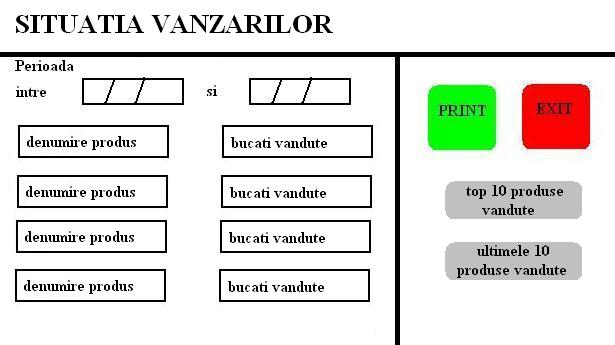Primul raport este Situatia Vanzarilor. Acest raport are doua optiuni: afiseaza cele mai bine vandute 10 produse sau cele mai prost vandute 10 produse in functie de o perioada de timp introdusa de la tastatura. Acest raport este util pentru intocmirea comenzilor de stoc, este un factor important in determinarea produselor cu cea mai mare si mai mica cerere pe piata.
