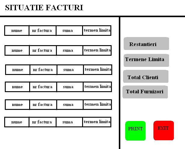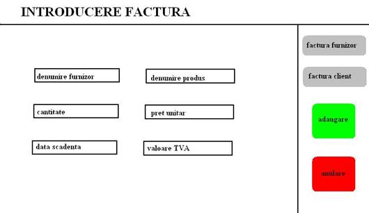 Trebuiesc proiectate si intrari pentru facturi si informatii despre furnizori si clienti pentru a permite urmarirea relatilor cu colaboratori: rau platnici, clienti fideli, termene limita etc.