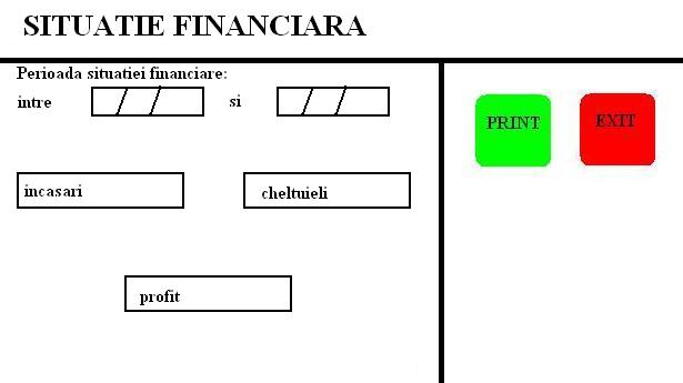 Raportul Situatie Financiara afiseaza incasarile de la clienti si cheltuielile cu furnizorii asupra unei perioade de timp introdusa de la tastatura. De asemenea raportul calculeaza un profit brut strict ca diferenta dintre incasari si cheltuieli. Aceste raport este util pentru statistici periodice in cadrul departamentului economic.
