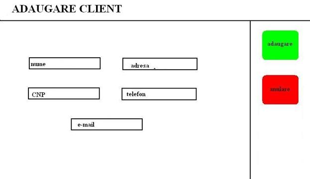 Adaugare Client este interfata de adaugare a unui client nou in baza de date, dupa completarea campurilor butonul adaugare adauga inregistrarea, iar butonul anulare anuleaza inregistrarea si paraseste formularul.