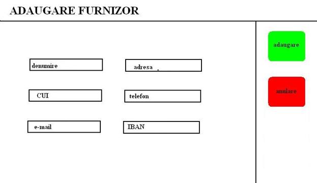 Adaugare Furnizor este un formular similar cu celelalte intrari, el functionand in acelasi fel si avand tot un buton de adaugare si unul de anulare.