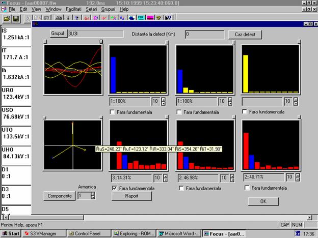 Analiza grupului 3U3I cuprinde: vizualizarea armonicilor tensiunilor si curentilor implicate, vizualizarea fazorilor si a graficelor suprapuse ale marimilor. Corespunzator pozitiei cursorului activ in document, se aplica algoritmul de calcul al distantei pina la defect. Distanta pina la defect corespunzatoare pozitiei cursorului este afisata sub eticheta Distanta (km).