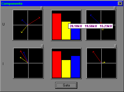 Pe fiecare rind primul dreptunghi reprezinta fazorii componentelor directa, inversa si homopolara, al doilea dreptunghi reprezinta valorile in modul ale componentelor, iar in al treilea dreptunghi sunt reprezentati fazorii armonicilor.