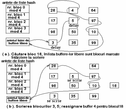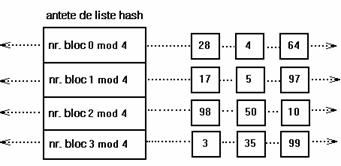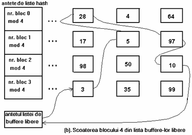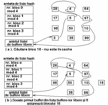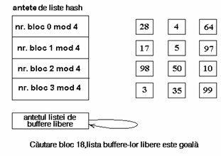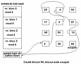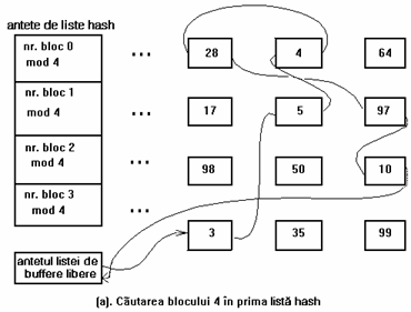 Figura 3 ilustreaza dispunerea buffere-lor in listele hash. Antetele listelor hash sunt in partea stanga a figurii, iar patratelele de pe fiecare rand sunt buffere din lista hash. Astfel, patratele marcate cu 28, 4 si 64 reprezinta buffere-le din lista hash corespunzatoare 'numarului blocului 0 mod 4' (numar bloc modulo 4 egal cu 0). Liniile intrerupte dintre buffere reprezinta pointerii din lista (inainte si inapoi). Pentru simplificare, in urmatoarele figuri nu se vor mai reprezenta acesti pointeri, insa existenta lor este implicita. Similar, figura identifica blocurile numai prin numerele asociate lor si utilizeaza o functie de dispersie dependenta numai de numarul blocului. Totusi, implementarile reale folosesc si numarul dispozitivului.