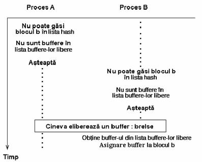 In acest fel, cautand din nou blocul, se asigura ca un singur buffer contine blocul disc. Figura 10 ilustreaza concurenta dintre doua procese pentru ocuparea unui buffer liber.