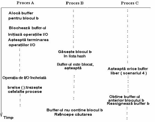 Procesul B trebuie sa mai verifice si daca buffer-ul contine blocul disc pe care l-a solicitat initial, deoarece procesul C putea sa aloce buffer-ul unui alt bloc, ca in scenariul 2. Cand se executa procesul B, acesta verifica daca buffer-ul este cel asteptat, iar in caz negativ este necesar sa caute din nou blocul. Daca ar urma sa aloce automat un buffer din lista buffere-lor libere, s-ar scapa din vedere posibilitatea ca un alt proces sa fi alocat deja un buffer pentru acel bloc.