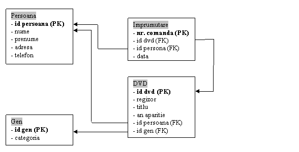 DVD (id_dvd (PK), regizor, titlul, an_aparitie, id_gen (FK))