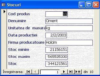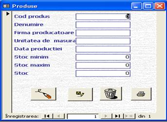 Se deschide un formular care ne permite sa vizualizam inregistrarile din tabela produse si, la alegere putem modifica, sterge sau adauga inregistrari cu ajutorul butoanelor din partea de jos a ferestrei. Avem la dispozitie un care va scoate la imprimanta tabelul produse .Tot aici se pot localiza anumite inregistrari dorite.