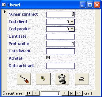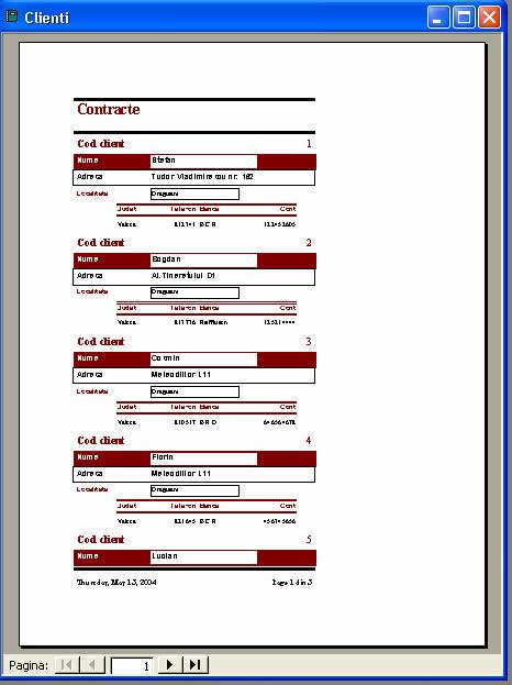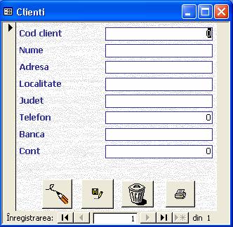 Se deschide un formular care ne permite sa vizualizam inregistrarile din aceasta tabela si, la alegere putem modifica, sterge sau adauga inregistrari cu ajutorul butoanelor din partea de jos a ferestrei. Tot cu ajutorul acestor butoane se scoate la imprimanta toti clientii firmei.