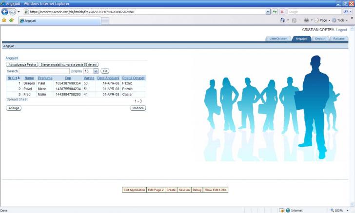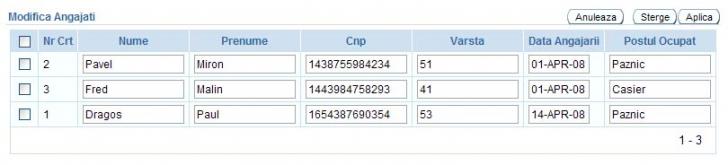 Butonul Modifica ne trimite in pagina in care putem efectua modificari pe tabela Costea_angajati. Operatiile pe care le putem efectua sunt: anuleaza, sterge si aplica.