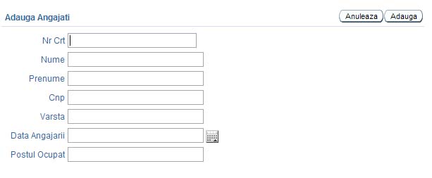Prin efectuarea click-ului pe butonul Adauga ajungem in pagina prin care se poate realiza adaugarea de informatii in tabela Costea_angajati.