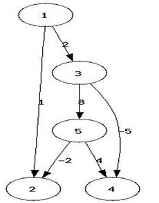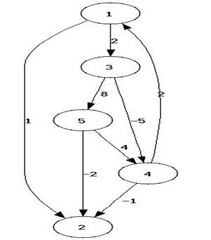 Prin ciclu de cost negativ intelegem un ciclu in care suma costurilor muchiilor ce fac parte din drum este negativa. In figura de mai sus drumul 1->3->4->1 are cost negativ. Se observa ca suma costurilor muchiilor de pe acest drum este negativa (2+5+(-2))=-1. Datorita acestui ciclu nu se poate obtine un cost minim pentru drumul (1,2) de exemplu deoarece la fiecare parcurgere a drumului de cost negativ costul drumului (1,2) mai scade cu o unitate. Astfel dupa n parcurgeri costul drumului (1,2) va fi n-2.