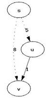 In figura 4, in momentul in care se analizeaza muchia (u,v) exista un cost estimat pentru drumul s..v - d[v]=8 si un cost estimat pentru drumul s..u - d[u]=5. Se observa usor ca drumul dintre s..u..v este mai bun din punct de vedere al costului decat drumul s..v al carui cost este calculat pana in prezent deoarece d[v]>d[u]+w(u,v). Relaxarea consta in actualizarea d[v] in conditiile in care inegalitatea de mai sus este adevarata deoarece s-a gasit un drum evident mai bun in momentul de fata (am obtinut un optim local mai bun decat cel estimat la un pas precedent)