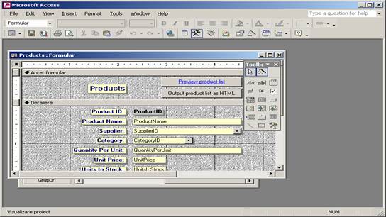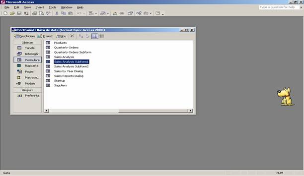 Pentru a deschide un formular, se alege din bara de butoane grupul Forms. In partea dreapta a ferestrei sunt afisate toate formularele existente.