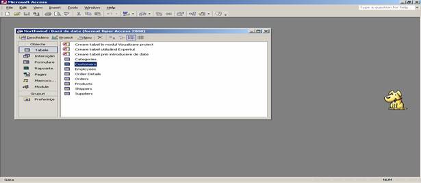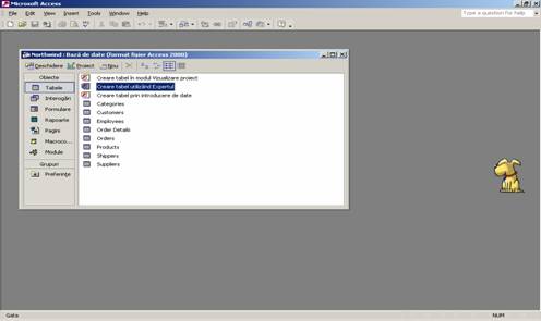 In mijlocul ferestrei, in spatiul de lucru se afla o alta fereastra, care reprezinta "centrala de navigare" a bazei de date in care pot fi amplasate tabelele, interogarile, formularele de introducere si rapoartele (iesirile).