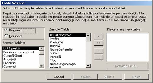 Fiecare din aceste grupe consta din mai multe tabele-exemplu, care pot fi alese dintr-o lista (Mailling list, Contacts, Customers, Employees, Products, Ovders, .), iar pentru fiecare tabel contine mai multe campuri-exemplu, care pot fi utilizate pentru viitoarele tabele (Customer ID, Company name, Contact first name, Contact last name, Company or department, Billing address, City, State or Province, Postal Code Country, .).