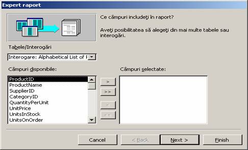 Daca alegerea nu corespunde necesitatilor dorite, se foloseste butonul de renuntare, dupa selectarea campului respectiv din fereastra Fields in my new table.