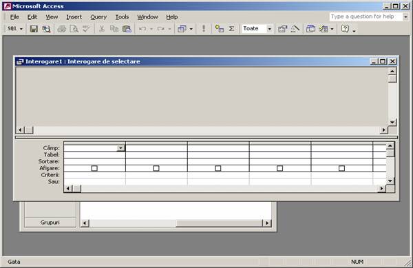 In partea inferioara a ferestrei, sunt listate toate campurile care sunt utilizate pentru o interogare (afisate la o interogare) pentru un anumit tabel.