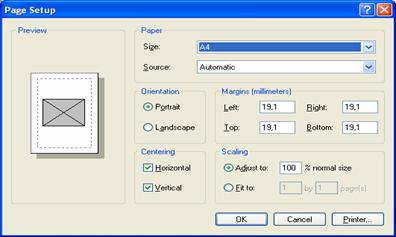Permite alegerea valorilor parametrilor care determina aranjarea in pagina a desenului la tiparire: dimensiunea paginii, marginile, etc. |