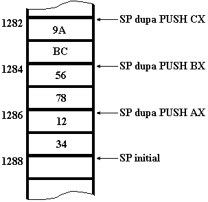 Daca registrele de mai sus contin valorile AX = 1234H, BX = 5678H si CX = 9ABCH, iar registrul SP contine (inainte de salvari) valoarea 1288H, atunci imaginea stivei va fi cea din Figura