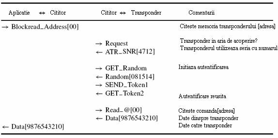Tabel 1 Exemplu de executie a unei comenzi de citire a aplicatiei software, cititor si transponder