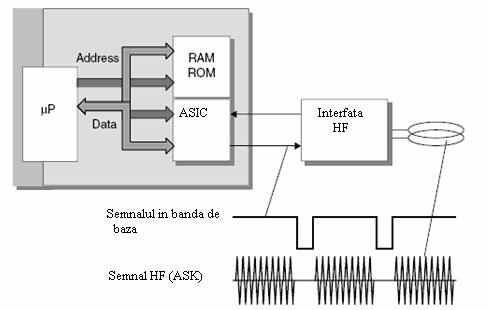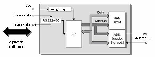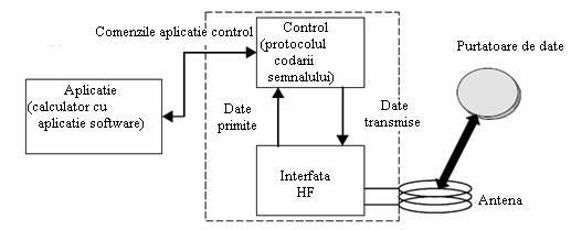 Un numar de proceduri pentru transmisia fara contact au fost deja descrise anterior.In ciuda diferentelor fundamentale ale tipurilor de cuplaj(inductiv-electromagnetic), a secventei de comunicatie, procedurii transmisiei de date de la transponder catre cititor(modulatia de sarcina, subarmonica) si ultimul dar nu cel din urma, domeniului de frecventa, toate cititoarele sunt similare in principiul lor de operare si deci in proiectare. Cititoarele in toate sistemele pot fi reduse la doua blocuri fundamentale: sistemul de control si interfata HF, constand dintr-un transmitator si un reciver(fig 2).Figura 3 prezinta un cititor pentru un sistem RFID cu culpaj inductiv.In partea dreapta se poate vedea interfata HF, care este ecranata impotriva emisiilor nedorite de o carcasi dintr-o placi de cositor.Sistemul de control este situat in partea stanga a cititorului si, in acest caz, contine un modul ASIC si microcontroler.Cu scopul de a fi integrat intr-o aplicatie software, acest cititor are o interfata RS 232 pentru a executa schimbul de date intre cititor (slave) si aplicatia software externa(master).