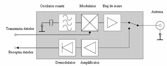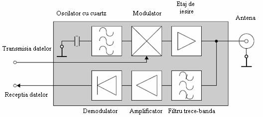 Senmalul oscilatorului este introdus intr-un modul de modulatie, controlat de semnalul in banda de baza al sistemului codarii semnalului.Acest semnal in banda de baza este acordat direct cu nivelul TTL, in care datele binare sunt reprezentate folosind un cod serial (Manchester, Miller, NRZ).In functie de tipul modulatorului, modulatia ASK sau PSK este realizata pe semnalul oscilatorului.