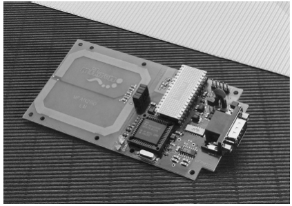Fig 3 Exemplu de cititor.Cele doua blocuri functionale, interfata HF si sistemul de control pot fi diferentiate clar.