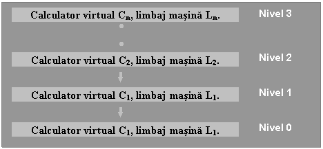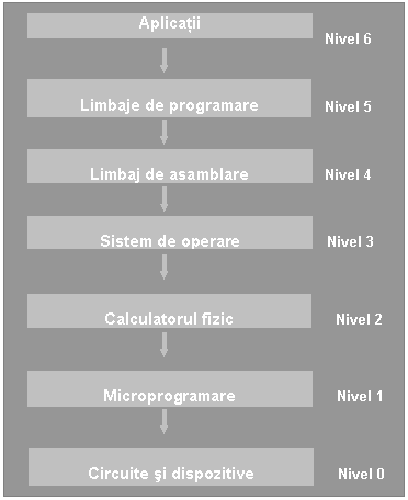 & In concluzie se poate spune ca un calculator poate fi vazut ca o suita de niveluri, fiecare inglobandu-le pe cele precedente. Un nivel reprezinta un grad oarecare de abstractizare si contine diverse obiecte si operatii cu aceste obiecte. In sens ascendent creste complexitatea prelucrarii, iar in sens descendent creste volumul materialului prelucrat.