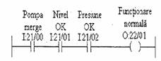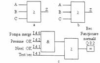 Iesirea unei porti SI, prezentata in figura 5.a este adevarata daca (si numai daca) toate intrarile sunt adevarate. Operarea portii din figura 5.a poate fi reprezentata prin tabelul din figura 5.b. in figura 5.c avem lampa , de semnalizare 'Functionare normala' a pompei din figura 1 conectata la un AP al firmei Siemens programat utilizand blocuri functionale.