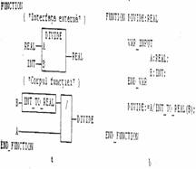 Partea superioara a figurii defineste interfata grafica a functiei, prin numele ei, numele si tipul variabilelor de intrare si tipul rezultatului. Partea inferioara defineste in forma grafica corpul functiei. Ca si in figura 12.b, toate declaratiile sunt delimitate prin cuvintele-cheie FUNCT1ON si END_FUNCTION.