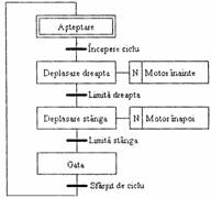Atunci cand limitatorul dreapta detecteaza sosirea caruciorului, valoarea variabilei Limita dreapta-devine adevarata. Acest lucru valideaza tranzitia de la pasul Deplasare dreapta la pasul Deplasare stanga. Secventa de evenimente ce urmeaza poate fi usor dedusa pe baza celor prezentate. Un ultim aspect ce trebuie mentionat este acela ca, la sfarsitul unui ciclu complet (reprezentat prin conditia Sfarsit de ciclu), controlul revine la pasul Asteptare, pentru a putea reincepe .un nou ciclu.