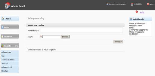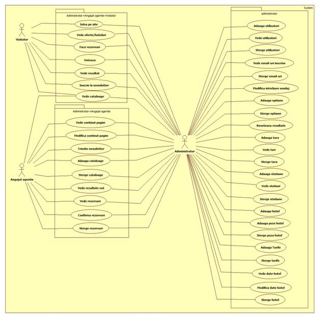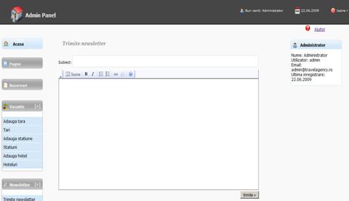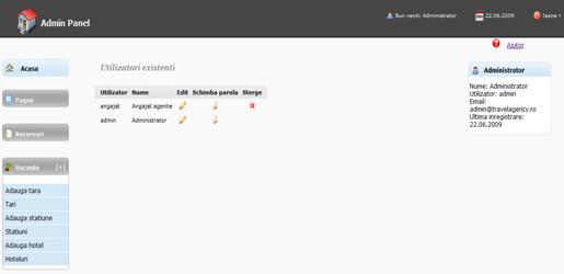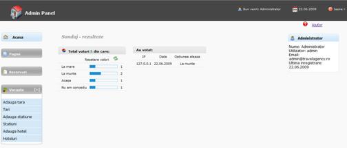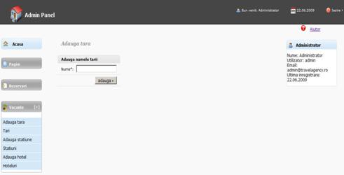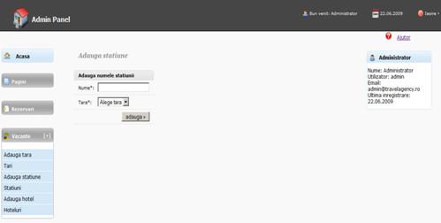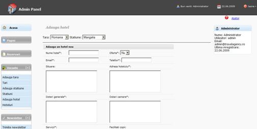 Fiecare sectiune poate fi administrata, continutul siteului fiind in totalitate dinamic. Se poate adauga, modifica, sterge: tara, statiune, hotel.