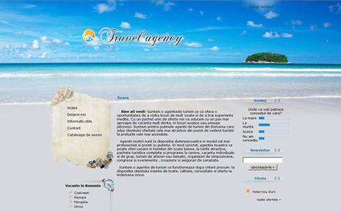 Prima pagina a site-ului contine in centru informatii generale despre agentie. In partea stanga se gaseste meniul site-ului si lista statiunilor, respectiv a tarilor. Partea dreapta a site-ului contine in partea de sus un link -care ofera posibilitatea vizitatorului de a schimba designul site-ului; sondajul; formularul de inscriere la newsletter si lista hotelurilor care au oferte.
